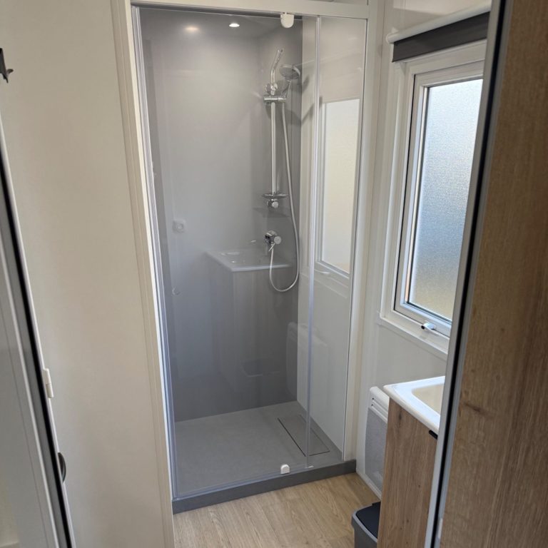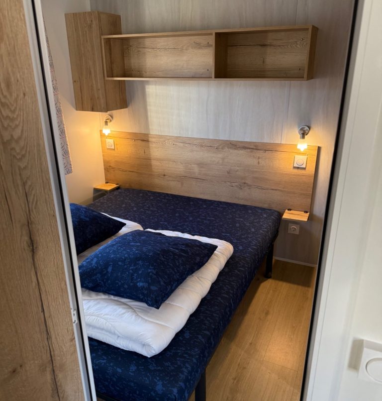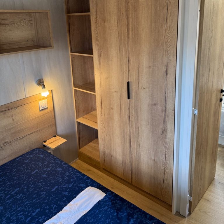 Das Schlafzimmer (1) bietet mit dem 1,60m x 2,00 m Bett großen Komfort. Zudem kann in einem großen Schrank die Kleidung untergebracht werden. Integrierte Verdunkelungsplissees, sowie hochwertige Fliegengitter runden das Schlafzimmer ab.
