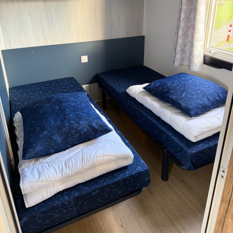 Die zwei getrennten Kinderbetten und ein integrierter Kleiderschrank bestimmen das zweite Schlafzimmer. Abgerundet wird auch dies durch integrierte Verdunkelungsplissees, sowie hochwertige Fliegengitter.